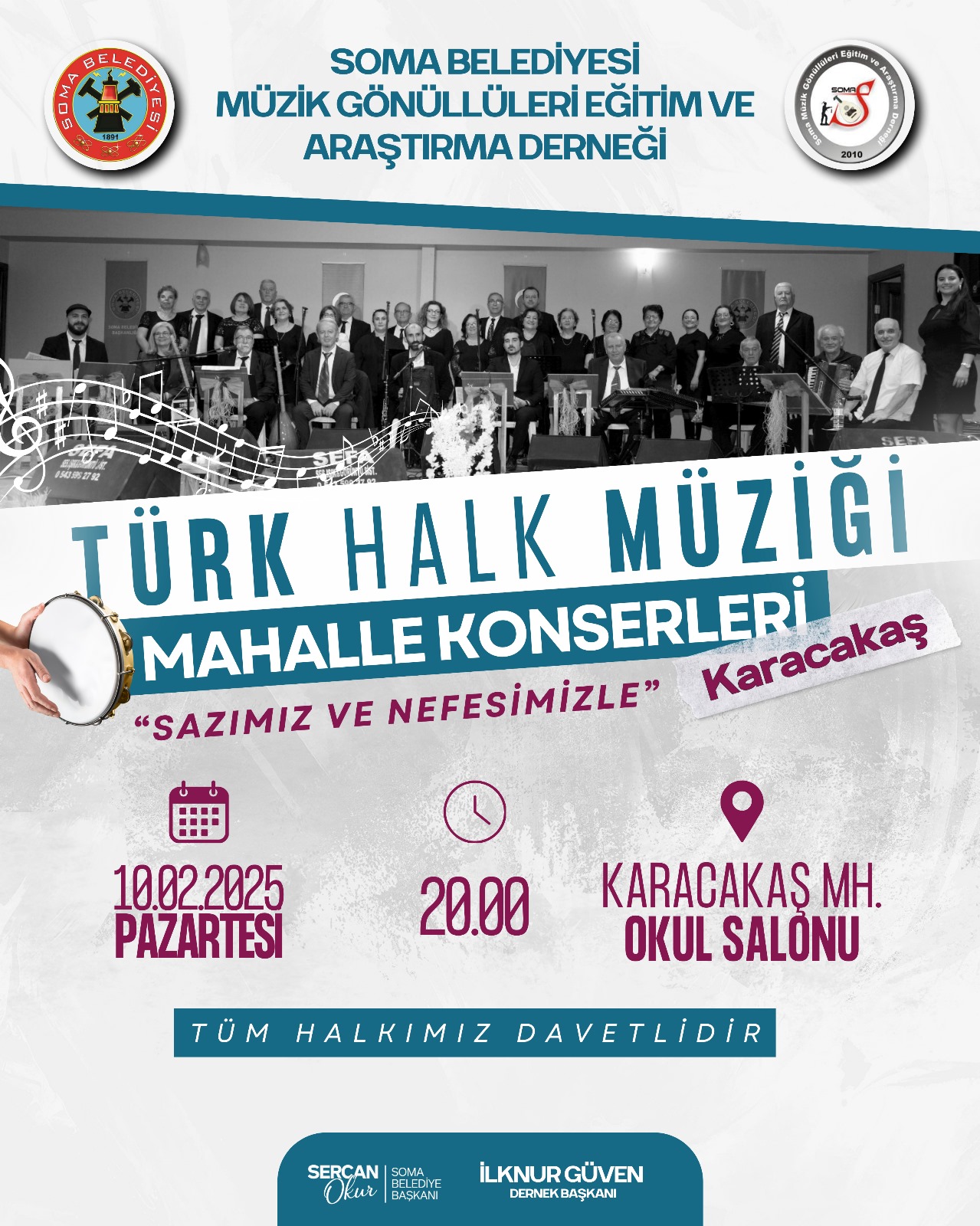2010 yılından bu yana faaliyetlerini aralıksız sürdüren Soma Belediyesi Müzik Gönüllüleri Eğitim ve Araştırma Derneği Soma Belediye Başkanı Ali Tulup’un da desteğiyle “Mahalle Konserlerine” devam ediyor.
